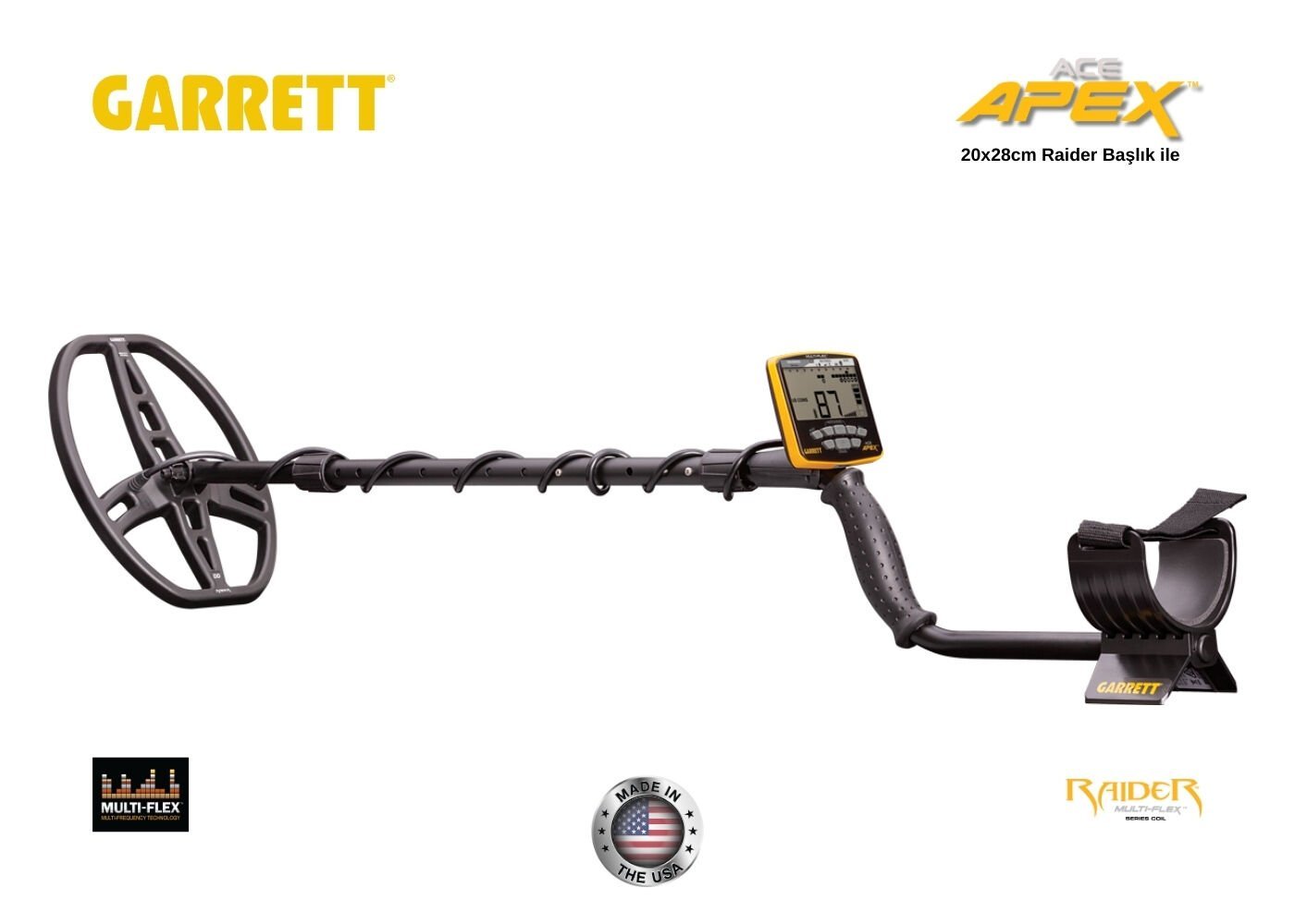 - Garrett Ace Apex metal dedektör, 8.5"X11" DD Multi-Flex Raider derin su geçirmez arama başlığı ve başlık kapağı ile teslim edilir.