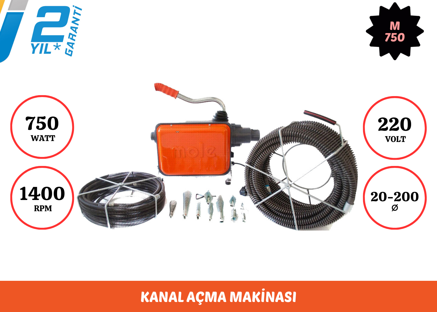 Mole M750 Kanal Açma Makinesi, kanalizasyon, gider ve tesisat borularında oluşan zorlu tıkanıklıkları hızlı ve etkili şekilde gidermek için tasarlanmış profesyonel bir çözümdür. Güçlü 750 W motoru sayesinde yoğun tortu, yağlanma ve katı atık kaynaklı tıkanıklıklarda yüksek performans sunar. Farklı çap ve uzunluklardaki spiral seçenekleri ile hem kısa mesafeli giderlerde hem de uzun boru hatlarında güvenle kullanılabilir. Dayanıklı gövde yapısı ve ergonomik tasarımı sayesinde sahada uzun süreli kullanımlar için idealdir. Profesyonel tesisatçılar ve altyapı ekipleri için güvenilir bir kanal açma makinesidir.