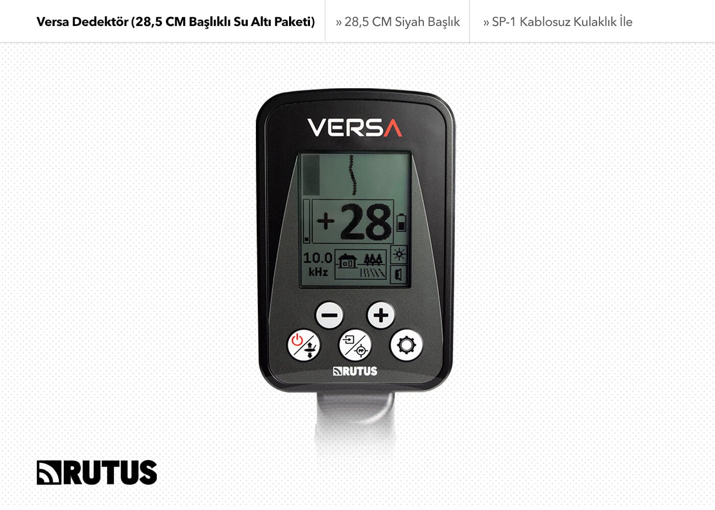 Rutus Versa Dedektörün ekranı güçlü güneş ışığında bile rahatça okunabilir. Rutus Versa Dedektör modelinin dikkat çekici bir özelliği, hedefin değerli mi yoksa önemsiz mi olduğunu gösteren görsel bir ekran kimliği grafiğine sahip olmasıdır. Ses ve sayı değerleri birleştirildiğinde, kullanıcıya hedefin niteliği hakkında önemli bilgiler sunarak kazma öncesi değerlendirme yapma imkanı tanır.
